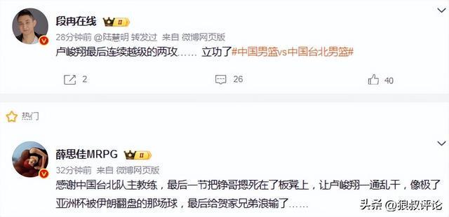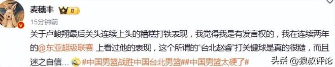 媒体人杨毅在最后时刻的点评,同样提到了卢峻翔,中国台北男篮正常应该交给陈盈骏和林庭谦处理,而卢峻翔太想当英雄。