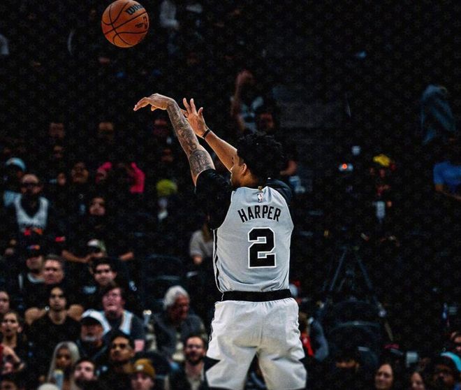 哈珀的三分箭箭穿心,文班亚马在内线予取予求,卡斯尔和凯尔登也轮番发力,半场战罢马刺69-57领先12分。