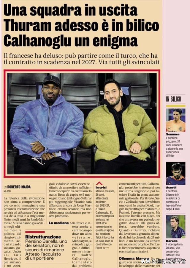 有些报道,“情绪价值”太多,实质内容太少,八字没撇,只能姑妄听之。比如《米兰体育报》恶炒,国米将推进“彻底、完全的深彻换血”,甚至都开始炒作国米将恰尔汗奥卢、小图拉姆,甚至是巴雷拉全部扫地出门的事了。