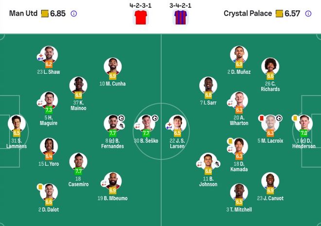 水晶宫首发:1-迪恩·亨德森、2-穆尼奥斯、26-理查兹、5-拉克鲁瓦、23-坎沃、3-米切尔、20-沃顿(68'19-休斯)、18-镰田大地(85'10-皮诺)、7-伊斯梅拉·萨尔、11-约翰逊(58'29-盖桑)、22-拉尔森(58'34-里亚德)