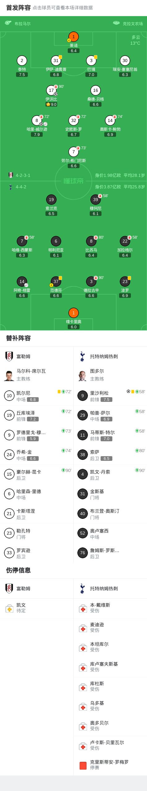 北京时间3月1日英格兰足球顶级联赛 第28轮,富勒姆主场对阵托特纳姆热刺。上半场哈里-威尔逊率先破门,随后伊沃比又破门。里沙利松头球扳回一球。最终比分富勒姆 2-1 热刺。